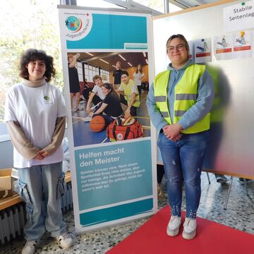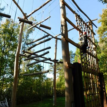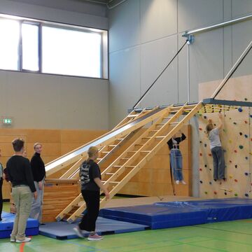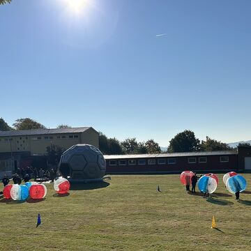 Hoch hinaus ging es mehr oder weniger waghalsig auf dem etwa 7m hohen neuen Kletterparcours der Stiftung - natürlich gut gesichert von den beiden Experten. Ganz Mutige wurden beim Bubble-Soccer selbst zu Bällen und rollten über die große Wiese hinter dem Berufskolleg.
