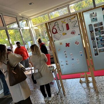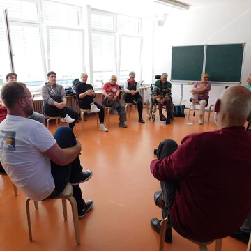 Etwas weniger abenteuerlich, aber dennoch sportlich ging es bei der Hockergymnastik zu, die von einem Bewohner der Stiftung mit voller Begeisterung angeleitet wurde. Dass Menschen mit und ohne Beeinträchtigung gemeinsam in gerademal fünf Minuten einen Tanz erlernen können, war ebenso beeindruckend wie die Ergebnisse beim Gestalten von Erinnerungsbildern von Schüler*innen der Topehlen-Schule. Für ausreichend Bewegung und Spaß sorgte auch ein großer Bewegungsparcours in der Turnhalle.